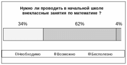 Большинство студентов-выпускников считают, что проводить внеклассные занятия по математике в начальной школе возможно, но не находят это необходимым. Около одной трети респондентов рассматривают внеклассные занятия по математике, как необходимый компонент своей будущей педагогической деятельности. Однако выявился и небольшой процент тех, кто считает эти занятия бесполезными и ненужными. Процентное соотношение ответов представлено на диаграмме: 1.