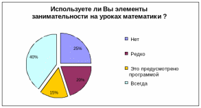 Более утешительные результаты были получены при ответе на вопрос об использовании учителями элементов занимательности на уроках математики. Чуть меньше половины респондентов ответили на вопрос положительно, четверть используют элементы занимательности на уроках, так как это предусмотрено программой, пятая часть редко, однако есть процент и тех, кто не использует их вообще. Более подробно результаты отражены на диаграмме 4.