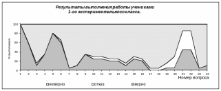 В последних двух задачах геометрического характера большие сложности возникли у учащихся первого экспериментального класса, лишь малый процент учеников справился с ними, тогда как в других классах таких затруднений не возникло. Возможно, причина этого в том, что учителя последних классов проводят подобные упражнения со своими учениками, детям они не новы.