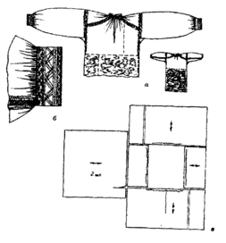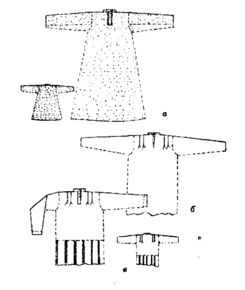 Туникообразные рубахи. Еще в начале - первой трети XX в, в Алтайском округе сохранялись, а кое-где встречаются и сейчас, реликтовые, туникообразного покроя женские рубахи, называвшиеся становины, пропускнушки. Основу стана в них составляло перегнутое по утку полотно с пришитыми по сторонам 2-мя прямыми или 4-мя кошеными бочками (боковинами). Рукава в таких рубахах вшиты в пройму, образуемую центральным полотном и более короткими боковинами (рис. 1, а).