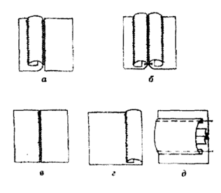 Рис. 4. Технологические приемы шитья в рубахах: а, б - швы соединения верха со станом; в - швы соединения полотен стана; г, д - обработка низа стана