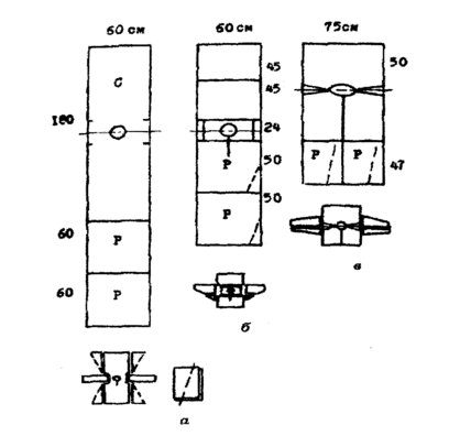 Показанные информаторами способы раскладок кроя дают представление об очень рациональных, безостатковых раскроях (рис. 1). При их выполнении руководствовались традициями, а также шириной тканого полотна (35 - 60 см), которая ограничивалась размерами ткацкого станка - "кросен". Если при крое все же получались небольшие остатки (как правило, в более поздних вариантах), то они использовались на обшивку ворота, низа рукавов.