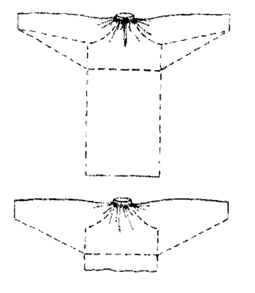 Появление на Алтае женских рубах с плечевыми швами, представляющих собой качественно новую ступень в развитии и совершенствовании кроя одежды, относится к первым десятилетиям XX в. Но еще и в 20 - 30-х гг. здесь бытовали рубахи с плечевыми вытачками, в которые собирали излишки ткани на плечах, не разрезая ее. Прострачивание швов-вытачек являлось, таким образом, еще народным приемом шитья, соблюдавшим требование как можно меньше резать материал. Этот прием резко отличался от принципов шитья городской мещанской одежды, имевшей криволинейную конструкцию и плечевые швы. Следовательно, рубахи с плечевыми вытачками, сохраняя, с одной стороны, связь с прежними конструкциями одежды, с другой - приблизились к покроям с плечевыми швами, так как вытачки способствовали лучшему облеганию в области плечевого пояса (рис. 9).