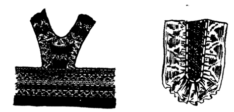Рис. 11 Украшение спинки и переднего разреза (позументом, шнуром, тканьем, вязаным кружевом) кумачового сарафана