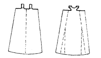 Наряду с вышерассмотренными сарафанами у крестьянок Южного Алтая во второй половине XIX - начале XX вв. бытовала и другая традиция, связанная с бытованием глухих видов одежды. Это аналогичного покроя сарафаны, однако, глухо зашитые по переднему шву. В погребальной одежде сшитые из холста сарафаны в качестве дериватов одежды более закрытого покроя сохранили цельнокроенную с задним полотном за-душку, мысики-лямки (рис. 12).