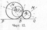 PQ. Для такого случая рассматриваем решение задачи отдельно. В результате получим, что если ОА не перпендикулярна PQ, то задача имеет два решения, за исключением случая, когда окружность (О; ОА) пересекает PQ в точке А, так как тогда прямые ВМ, ВN и ОА пересекутся в точке А, и окружности не получим. Если же OA