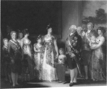 Один з групових портретів того часу — «Портрет сім'ї короля Карла IV» 11. У центр Гойя вмістив королеву. Вона обійняла дочку і тримає за руку сина. Карл IV в парадному мундирі стоїть декілька попереду, його обличчя байдуже. У лівій частині картини фігура в блакитному костюмі — це спадкоємець престолу, кронпринц Фердинанд. Поруч з ним, відвернувшись від глядача, стоїть його наречена. Такий ракурс художник обрав, щоб не показувати нам її обличчя — в момент написання цього групового портрета і сам Фердинанд ні разу не бачив її.