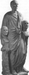 Римляни постають одягненими в парадний одяг — тогу. Портрет покликаний прославити знатність роду, а пізніше був пов'язаний з обожнюванням особи імператора. Ранні зображення передають силу і стій-кість характеру. Розвитку римської скульптури сприяв стародавній звичай робити посмертні маски і зберігати в будинку створені по них бюсти знаменитих предків, що передавалися з покоління в покоління. Збереглося зображення римського аристократа з портретами предків (рис. 1.2.).