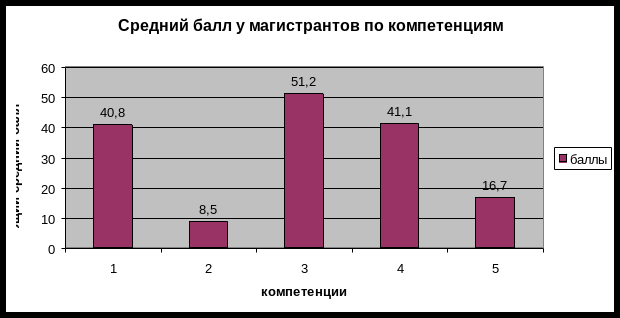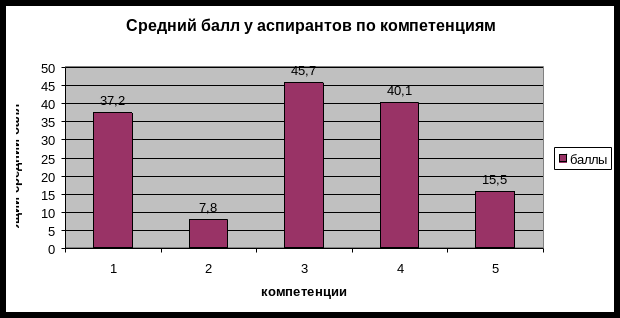 По полученным результатам видно, что свои личные качества и умения в совокупности компетенций аспиранты оценивают ниже, чем магистранты. Так на проектировочном уровне, включающем самореализацию и творчество, средний общий балл ниже магистрантского на 3,6 балла; на конструктивном 0,7; на организаторском – 5,5; на коммуникативном – 1; на гностическом уровне – на 1,2 балла.