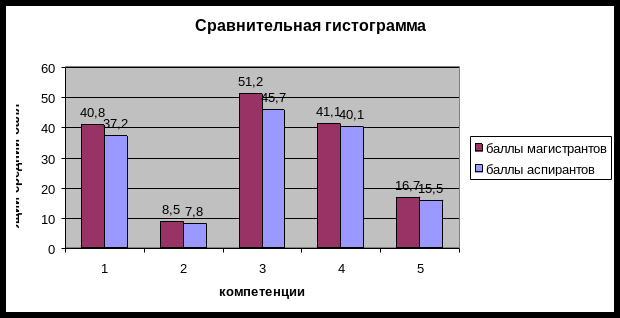 В результате проведенного опроса была получена сравнительная гистограмма по компетенциям у аспирантов и магистрантов.