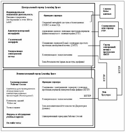 Learning Space состоит из двух компонентов: Центральной (основной) части и Вспомогательной части. Когда устанавливается Центральный Сервер, пользователи могут видеть Учебный и Управляющий интерфейсы без всяких вспомогательных функций (опций). Когда же к Основному добавляется дополнительный Вспомогательный Сервер, пользователи получают доступ к дополнительным функциям: рабочим сессиям, проводимым инструкторами, дискуссионным БД и чату. Схема 6 показывает, как функционируют оба сервера:21
