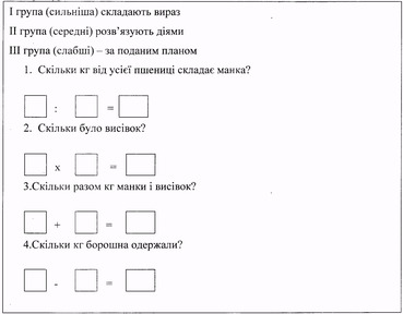 Учні, зазвичай, вставляють чистий листочок, обчислюють приклади чи вказують рід іменників і здають вчителю на перевірку. Результати виконання самостійних робіт вчителька перевіряє на тому ж уроці, помилки аналізує. Класовод традиційно враховує можливості кожного учня і практикує диференційовані самостійні завдання. Так, при розв’язуванні задачі клас поділено на три групи: