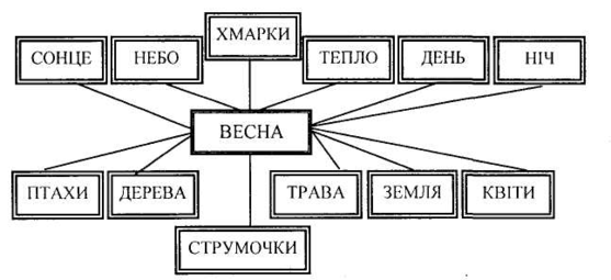 Прикладом такої роботи є також використання схеми (див. схему 1) для збагачення й активізація словника учнів під час написання твору про весну. Перша група дітей виконує завдання самостійно, друга – з допомогою вчителя.