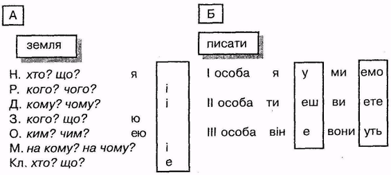 Виконуючи завдання за такими картками, учні пишуть у зошитах цілі слова тільки по одному разу – у верхніх, горизонтальних, прорізах, а у вертикальних, навпроти позначень відмінка (особи) – тільки закінчення.