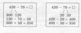 (№ 640-643). Учні розв’язують вирази виду 420-70, розкладаючи на зручні доданки зменшуване або від’ємник. |