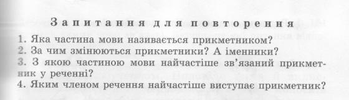 | 7 | Змінювання прикметників за родами у сполученні з іменниками. Родові закінчення прикметників (II, впр. 107-110). |