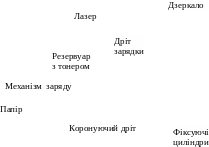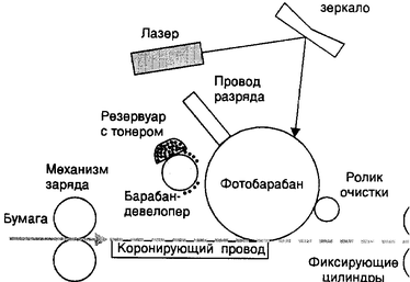 Найважливішим конструктивним елементом лазерного принтера (рис. 2.26, 2.28) є фотобарабан, що обертається, за допомогою якого відбувається перенесення зображення на папір. Фотобарабан є металевим циліндром, покритим тонкою плівкою з фотопровідного напівпровідника (звичайно оксид цинку). По поверхні барабана рівномірно розподіляється статичний заряд за допомогою тонкого дроту або сітки, званої коронуючим дротом. На цей дріт подається висока напруга, що викликає виникнення навколо нього іонізованої ділянки, яка світиться, званою короною.