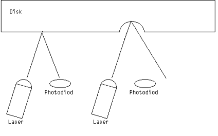 В процесі зчитування інформації з лазерних дисків промінь лазера в дисководі падає на поверхню диска, що обертається, і відбивається. Оскільки поверхня лазерного диска має ділянки з різними коефіцієнтами відбиття, то відбитий промінь також змінює свою інтенсивність (логічні 0 або 1). Потім відбиті світлові імпульси перетворяться за допомогою фотоелементів в електричні імпульси і по магістралі передаються в оперативну пам'ять.