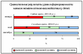 Анализ сравнительных результатов уровня сформированности навыков межличностного взаимодействия у детей (Диаграмма 1) позволяет говорить о положительной динамике за период сентябрь - май, 2004-05 уч.год(2 младшая группа) – январь, 2005-06 уч.год(средняя группа) . Так, изменились в качественную сторону:
