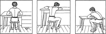 Пригадайте, яких правил слід дотримуватись, сидячи за столом чи партою у школі та в дома. (Стіл і стілець повинні відповідати зросту; сидіти за столом потрібно прямо, трохи нахилившись уперед; руки треба класти на стіл вільно, не спираючись на них; відстань між грудьми і столом повинна дорівнювати ширині долоні; ноги повинні стояти на підлозі і всією ступнею; коли відчули, що втомилися, потрібно поміняти положення тіла, відхилитися і спертися на спинку стільця.)
