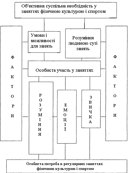 У формуванні потреби у фізичному вдосконаленні (схема 1) важливу роль відіграють такі чинники, як підвищення престижності і суспільної значущості занять фізичною культурою і спортом; забезпеченість матеріально-технічною базою і кадрами; оптимальне поєднання процесів залучення людей в практичні заняття і розширення, поглиблення їх знань про цінності засобів фізичної культури і спорту; збагачення змісту самих занять цікавими, емоційними формами і методами їх проведення; наближення занять до місць проживання і роботи; вдосконалення форм і спрямованості пропаганди фізичної культури і спорту та ін.