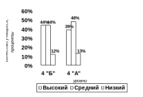 В контрольном классе (4 «А») результаты изменились совсем незначительно: 40 % детей имеют высокий уровень (на первом этапе обследования их было 35%), 48% детей имеют средний уровень (на первом этапе их было 44%), 12% детей имеют низкий уровень (на первом этапе их было 21%).