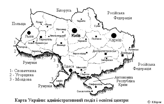 Рис.2.1. Карта „освітньої України” – розташування найбільших центрів вищої освіти на її території