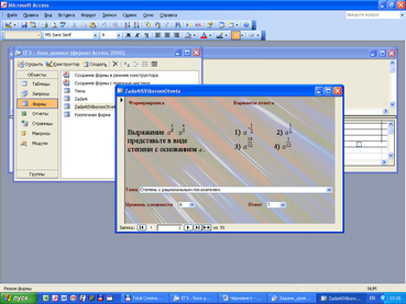 БД математических задач имеет следующие таблицы: KodOtveta, Reshenie, Tema, Zada4i, Zada4iSViboromOtveta. Поля: KodOtveta, Otvet, NoZada4i, Reshenie, KodTemi, Tema, NoZada4i, UrovenSlognosti, Formylirovka, VariantiOtveta. В таблицах Reshenie, Zada4i, Zada4iSViboromOtveta ключевым является поле NoZada4i. В таблице KodOtveta ключевое поле – KodOtveta. В таблице Tema ключевое поле – KodTemi. Поля Formylirovka, Otvet, VariantiOtveta, Reshenie имеют тип Поле объекта OLE. Тогда содержимое этих полей можно просмотреть, выполнив двойной щелчок по определенной ячейке. После этого откроется документ MSWord, в котором содержится вся необходимая информация.