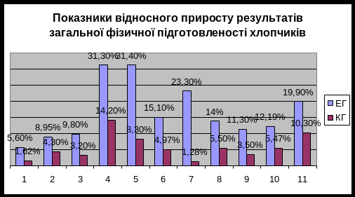 Рис. 4.1. Показники відносного приросту результатів фізичної підготовленості учнів досліджуваних груп