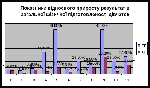 У дівчат контрольних класів зрушення становило 6,6 %, у експериментальних – 8, 07 %. Абсолютний приріст у порівнянні з хлопцями тут дещо нижчий, що свідчить про те що у цьому віці починає виявлятись статева різниця. Достовірної різниці між кінцевими результатами тут не виявлено (Р < 0,05).