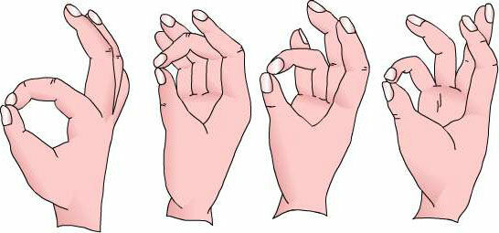 Показываем ребенку большой палец своей руки, затем поочередно соединяем его (прижимаем) с остальными пальцами той же руки под такой текст: