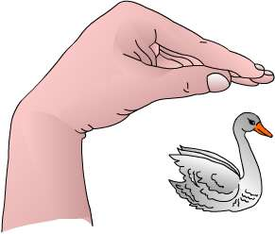 Используя экран, на который падает тень руки, показываем ребенку маму-гусыню: сжимаем все четыре пальца вместе, а большой прижимаем к ним снизу, пригибая кисть вниз: