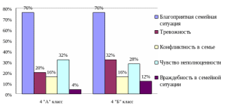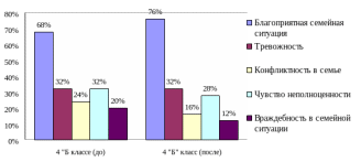 В 4 "Б" классе произошли значительные изменения в повышении благоприятной семейной ситуации, снизилось конфликтность и враждебность в семейной ситуации. Кроме того, снизилось чувство неполноценности, обусловленное неблагоприятной обстановкой в семье.