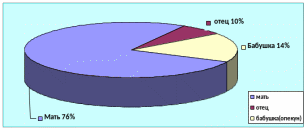 Анкетирование проводилось в Московском городском клубе инвалидов «Контакты-1», в опросе приняли участие 42 родителя, имеющих детей- инвалидов. В опросе приняли участие 38 женщин (32 матери и 6 бабушек- опекунов) и 4 мужчины (отца), что свидетельствует о том, что в большинстве случаев, воспитанием ребенка-инвалида занимаются матери.