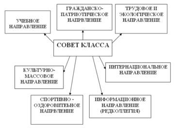 Сначала на собраниях классных коллективов выбирают представителей всех указанных направлений. Эти представители входят в состав секторов (с 5-го по 9 класс).