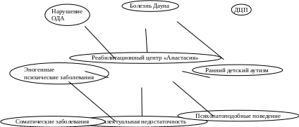 Дети, посещающие центр «Анастасия», представляют очень разнородную группу по своей клинической характеристике. Это дети с различными инвалидизирующими заболеваниями, большинство из которых сопровождаются различными отклонениями в поведении. У некоторых детей медицинские диагнозы связаны и с выраженными нарушениями поведения, требующие лечения и ухода. Группы инвалидизирующих заболеваний детей, посещающих реабилитационный центр «Анастасия» представлен на схеме 1.