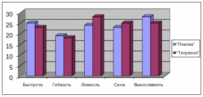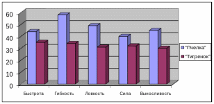 Была выведена общая диаграмма по физическим качествам старших дошкольников экспериментальной группы «Пчелка» и контрольной группы «Тигренок».
