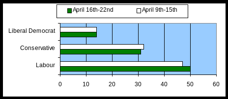 Таким образом, лейбористы могли получить в парламенте 474 места, тори 142, либеральные демократы – 26 мест. Особый пессимизм сторонникам тори внушал тот факт, что, несмотря на многочисленные попытки в течение последних 10 месяцев, консервативная партия никак не могла не только обеспечить себе столь необходимый рост популярности, но и восстановить утерянные позиции.