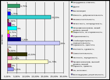 | (не более 5 ответов) | Скромность, простота; Слабохарактерность, нерешительность; Ограниченность; Закрытость, не откровенность; Непрофессионализм, низкий уровень знаний; Нечестность, непорядочность; Несамостоятельность; Мягкость, доброжелательность; Высокомерие; Другое Затрудняюсь ответить; | 0 28,00 7,20 1,25 0,75 50 20 0,50 23,25 1,75 0 6,75 | |||||||||||||