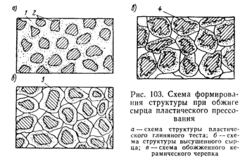 Во время сушки, по мере испарения из сырца влаги, зерна заполнителя сближаются между собой, контактируясь в отдельных точках и гранях, и образуют таким образом скелет высушенного изделия. Суспензия, высыхая, осаждает на скелете свою коллоидную фракцию. Таким образом, зерна заполнителя оказываются покрытыми сплошной «обмазкой» 3 из коллоидной фракции глины (рис. 103, б). Эта обмазка является наиболее легкоплавкой частью всей керамической массы, так как в ее составе находятся растворимые соли, имеющие наиболее низкие эвтектические температуры. Важным