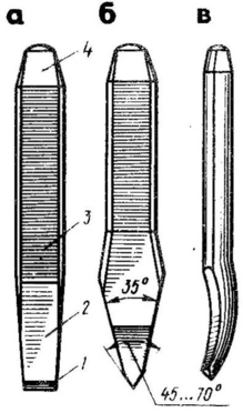 Крейцмейсель отличается от зубила более узкой режущей кромкой и предназначен, для вырубания узких канавок, шпоночных пазов и т. п. Однако довольно часто им пользуются для срубания поверхностного слоя с широкой плиты: сначала крейцмейселем прорубают канавки, а оставшиеся выступы срубают зубилом. Крейцмейсели изготовляют из тех же материалов, что и зубила. Значения углов заострения и твердости рабочих н ударных частей крейцмейселя и зубила также одинаковы.