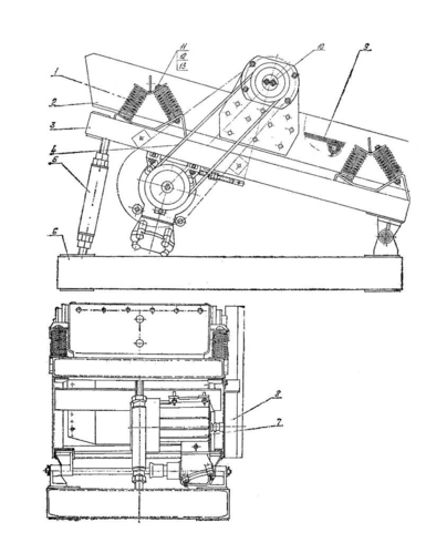 Поворотная рама представляет собой сварную конструкцию из швеллеров и угольников. К нижней ее части крепится электродвигатель, а к верхней — четыре пружинные опоры. Раму устанавливают под углом к горизонту посредством винтового механизма.
