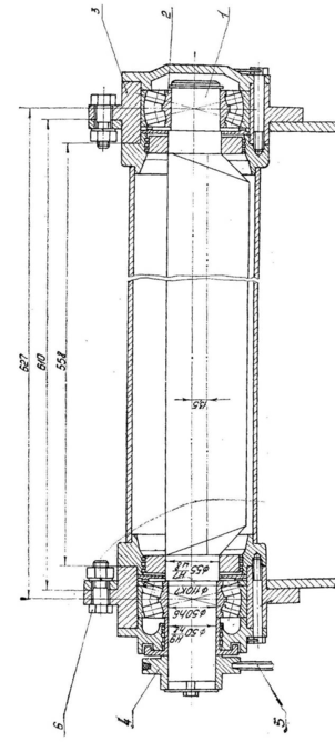 Инерционный вибратор состоит из дебалансного вала, вращающегося на роликоподшипниках, заключенных в корпусы, уплотнений подшипниковых узлов, приводного шкива, клиноременной передачи и крепежных деталей.
