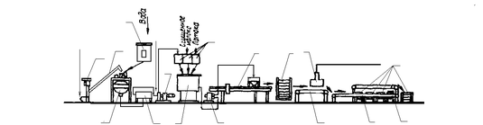 Лотки с затвердевшими корпусами снова подвозят и загружают в приемную часть конфетоотливочной машины. Здесь лотки опрокидываются, корпуса конфет отделяются от крахмала, и поступают на ленточный транспортер 12. Проходя по ленточному транспортеру корпуса конфет обдуваются от остатков формовочного материала устройством для обдувки 13, далее поступают на двухъярусный ленточный конвейер 14, где происходит выборка брака.