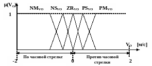 Определим терм-множество ЛП VО: Т(VО)={PMVО - скорость VО положительная (против часовой стрелки) средняя; PSVО - скорость VО положительная небольшая; ZRVО - скорость VО нулевая; NSVО - скорость VО отрицательная (против часовой стрелки) небольшая; NMVО – скорость VО отрицательная средняя}. На рис. 2.4 приведены функции принадлежности (VО) для нечетких переменных терм-множества Т(VО).