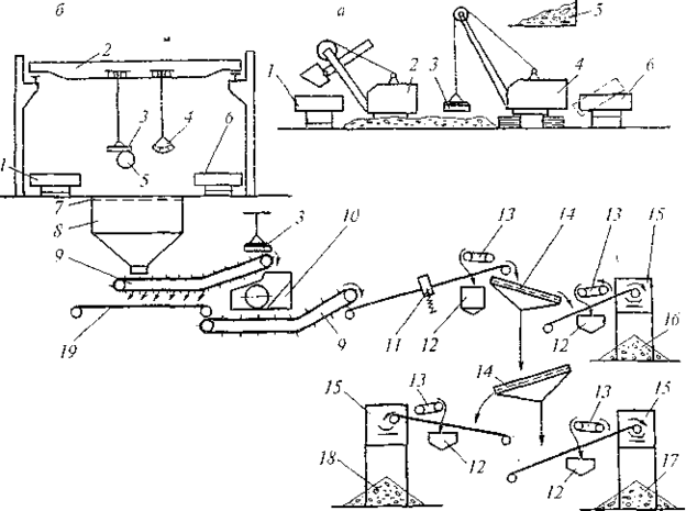 а — узел приемки шлака (1-думпкар для отсепарирования шлака, 2 — экскаватор; 3 – грузоподъемный электромагнит, 4 - дизель-электрический кран, 5— закрома для скрапа; о — думпкар исходного шлака); б - узел дробления и сортировки шлака (1 - думпкар для подачи шлака; 2 - грейфсрный кран; 3 - грузоподъемный электромагнит, 4 - грейфер; 5 - груз; 6- думпкар для скрапа; 7 - колосниковая решетка с ячейкой 500 х 500 мм; 8 - бункер для исходного шлака, 9- пластинчатый питатель; 10 - дробилка; 11 - конвейерные весы; 12 -бункер для скрапа; 13 - навесной железоотделитель, 14 - инерционный грохот; 15 - галерея, 16 - склад щебня фракции > 40 мм; 17 - склад щебня фракции 10 - 40 мм; 18 - склад щебеночно - песчаной смеси фракций 0 - 10 мм; 19 - конвейер для просыпи).