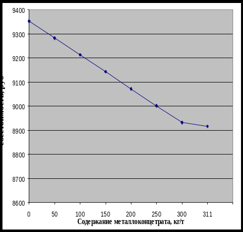 Влияние содержания металлоконцетрата в доменной шихте на себестоимость чугуна представлено на рисунке 3.4.