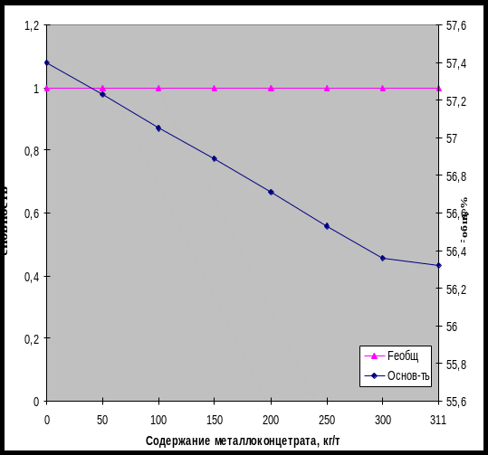 Рисунок 3.5 – Влияние содержания металлоконцетрата в доменной шихте на основность шлака и содержание железа в металлошихте