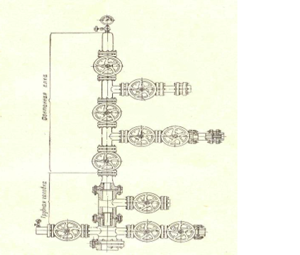 В мире существуют также и другие арматуры фонтанного типа. Арматура тройникового типа (рис. 7), ее отличие от арматуры крестового типа (рис. 6) в том, что на фонтанной елке отсутствуют крестовины, вместо них используются тройники. А также крестовая арматура по высоте меньше тройниковой; это облегчает ее обслуживание.