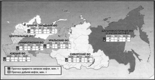 Согласно Энергетической стратегии главными районами прироста углеводородного сырья будут Западносибирская, Лено-Тунгусская и Тимано-Печорская нефтегазоносные провинции. Поиск, разведка и освоение нефтяных и газовых месторождений на шельфе арктических, дальневосточных и южных морей являются одним из наиболее перспективных направлений развития сырьевой базы нефтяной и газовой промышленность. Начальные суммарные извлекаемые ресурсы углеводородов морской периферии России составляют, по оценкам, около 100 млрд. т в пересчете на нефть. Основная часть этих ресурсов приходится на шельфы северных морей. С учетом географического распределения прогнозных ресурсов нефти и газа, а также достигнутого уровня геолого-геофизической изученности предполагается ускоренный рост подготовки запасов углеводородов в среднесрочной перспективе в Баренцевом, Карском и Охотском морях, а также в российском секторе Каспийского моря. Поиски новых месторождений нефти и газа должны быть продолжены в нефтегазоносных провинциях со снижающейся добычей нефти Волго-Уральской и Северокавказской. Для достижения намеченной Энергетической стратегией добычи предусматривается ввод новых месторождений на Сахалинском шельфе и шельфах северных морей в Тимано-Печорской и Восточносибирской нефтегазовых провинциях, где имеются значительные запасы нефти, но требуются доразведка и создание инфраструктуры практически с нуля. Перспективная добыча нефти в России будет определяться в основном следующими факторами: уровнем мировых цен на топливо, налоговыми условиями и уровнем применения научно-технических достижений в разведке и разработке месторождений, а также качеством разведанной сырьевой базы.
